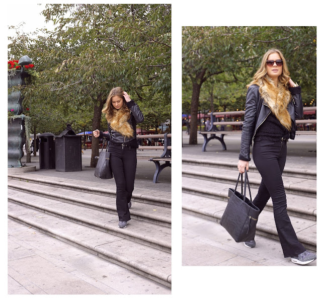 Warm en comfy! Er was een straffe wind en we waren omringd door water dus het was echt zo koud ik Stockholm, daar hadden we met inpakken geen rekening mee gehouden. Ter plaatse haddden we maar even een lekkere muts en wanten gekocht om een beetje bedekt te blijven tegen de wind. Ik ben tegenwoordig helemaal fan van de flared jeans, dus toen ik deze zwarte zag moest ik die gewoon hebben. Het is van een dik materiaal gemaakt dus ook een goede broek voor de winter. Ik denk dat dit soort broeken ook heel leuk staan met enkellaarsjes of witte sneakers. Nog een groot voordeel van zulke broeken: Je kunt lekkere je lelijke dikke sokken aandoen, zonder dat iedereen ze ziet!
